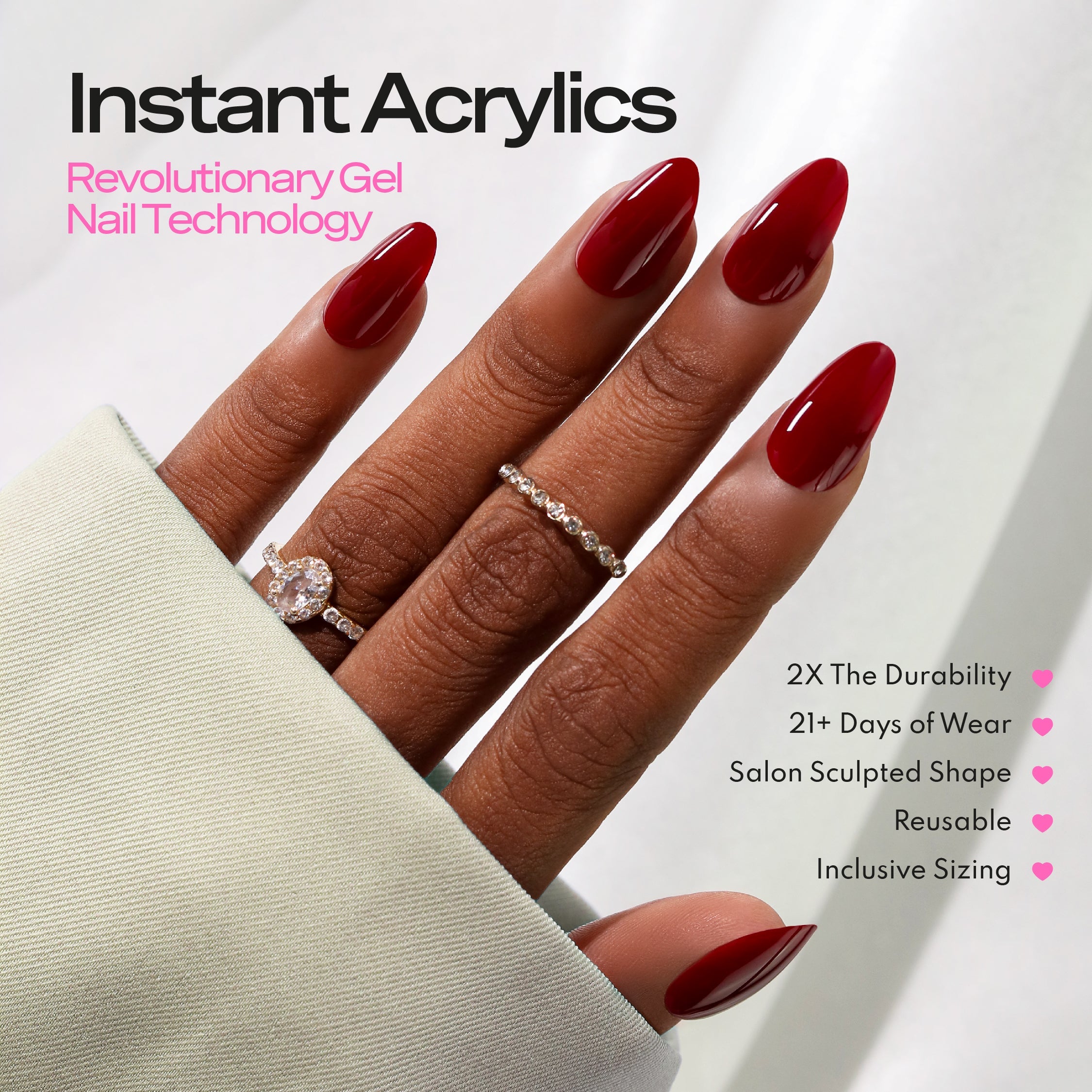 LUXXI Instant Acrylics™ Indulge in the richness of these deep red merlot nails, designed in a sleek short almond shape for a bold yet elegant look. This stunning, glossy finish adds a touch of sophistication, capturing the essence of luxury with every glance. The deep, intoxicating hue brings a sense of timeless beauty that’s perfect for any occasion. Whether you're dressing up for a night out or adding a pop of color to your everyday look, these nails are crafted to make a statement. Made with advanced gel technology, they offer durability and reusability, with up to 21 days of lasting wear.